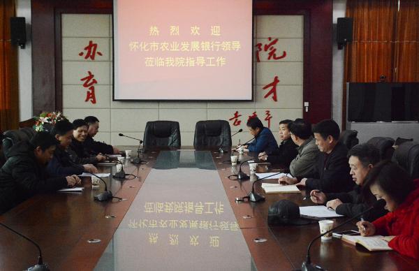 227日,怀化市农业发展银行行长田必升、怀化市农业发展银行创新投资部高级主管吴蔚等一行四人来访我院,我院党委书记胡佳武、院长王聪田、党委副书记邬国盛进行了热情迎接,并在我院多功能厅举行座谈会,就教育扶贫和建设融资等方面展开了深入交流。