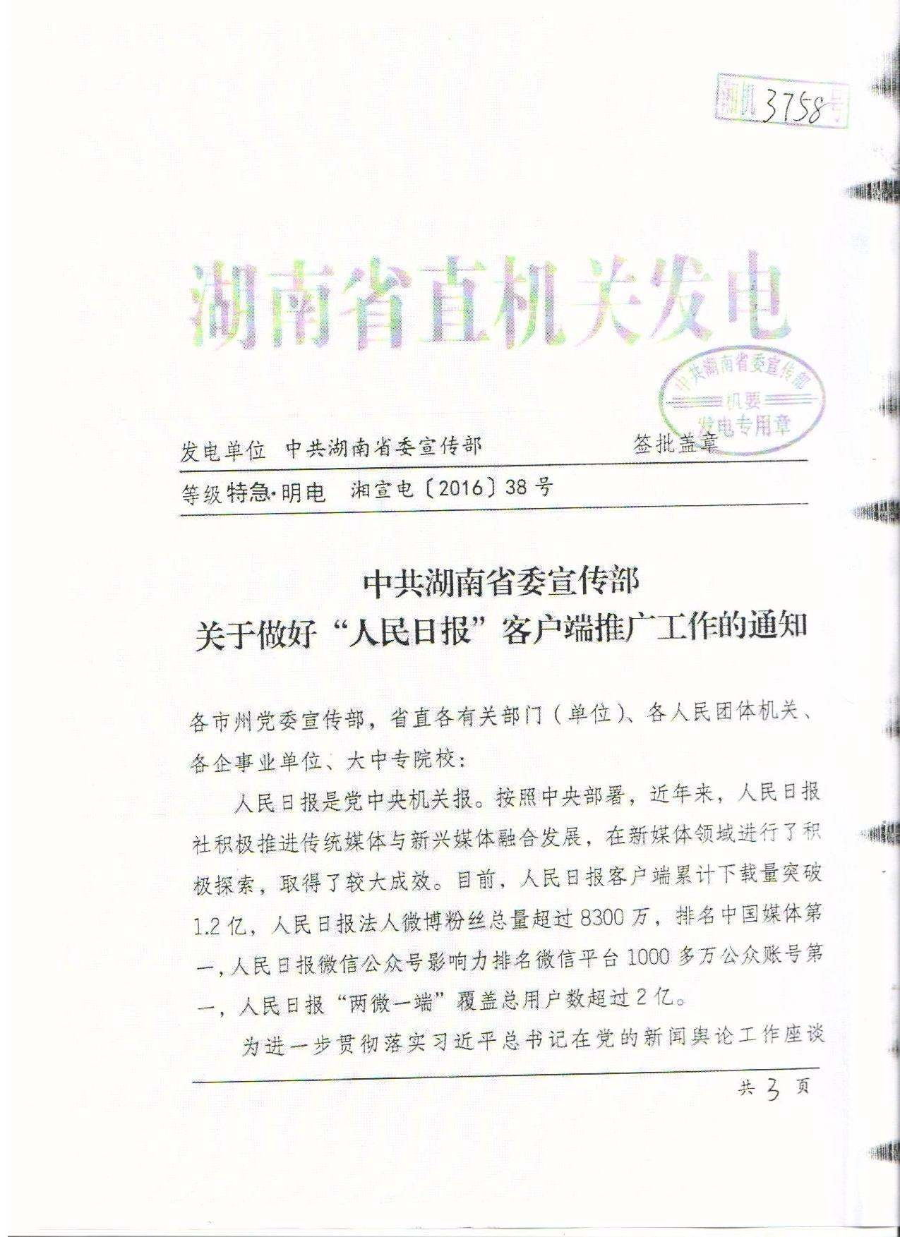转发中共湖南省委宣传部《关于做好“人民日报”客户端推广工作的通知》