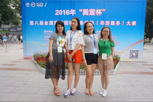 “导游服务”赛项分普通话导游服务和英语导游服务两个赛项。每个赛项分别包括自选导游讲解、抽选专题讲解、导游理论知识测试和才艺展示等四项内容。我院选送的14级旅游管理专业的学生姜翎馨雅(李玉华老师指导)凭借自己精彩的表现,经过激烈的角逐,获得全国职业院校中文导游服务技能比赛 “优胜奖”和最佳才艺展示奖,14级旅游管理专业的学生熊浣菁(刘慧老师指导)获英文导游服务技能比赛 “优胜奖”。这是今年我院旅游管理专业继参加湖南省职业技能赛获英文导游服务三等奖后再次获得专业技能大赛奖。