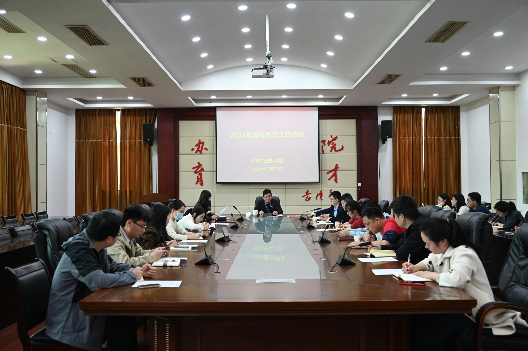 会议传达了全国、全省宣传部长会议和全市宣传部长会议精神。同时,大家一起学习了《怀化职业技术学院新闻报道管理办法》,并就如何做好学校宣传思想工作展开交流讨论。